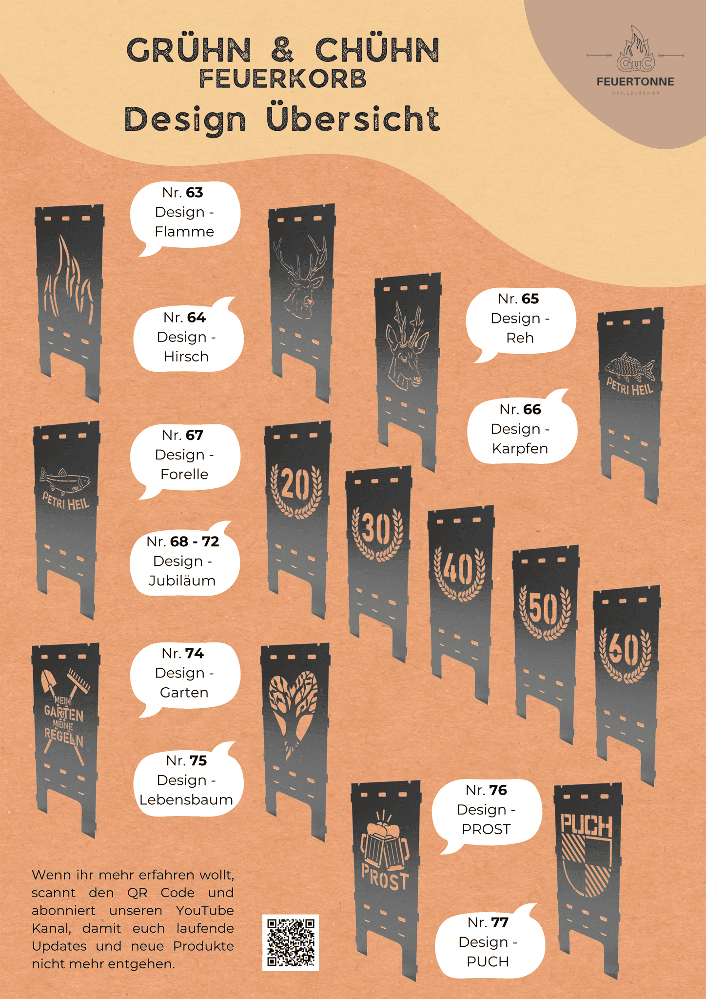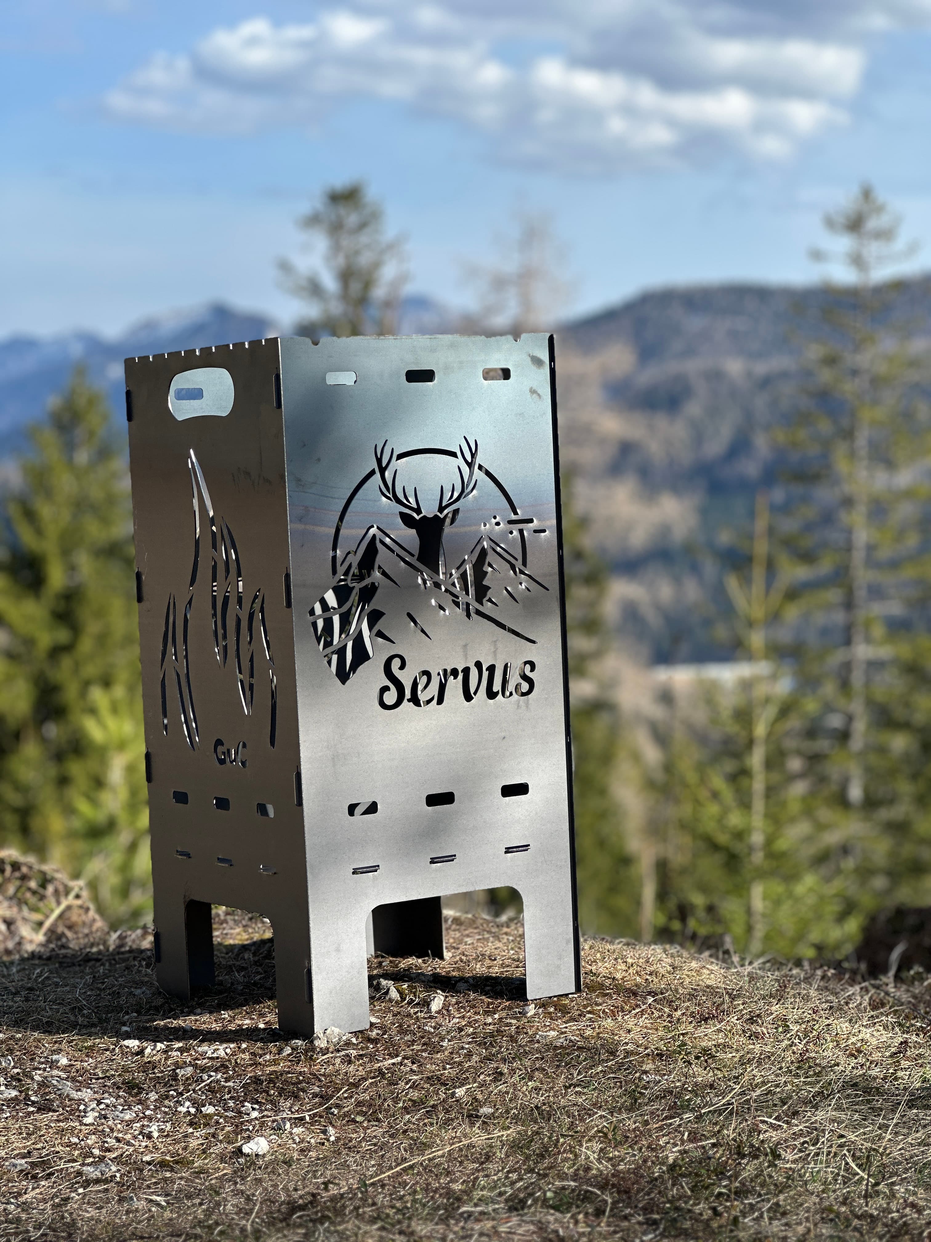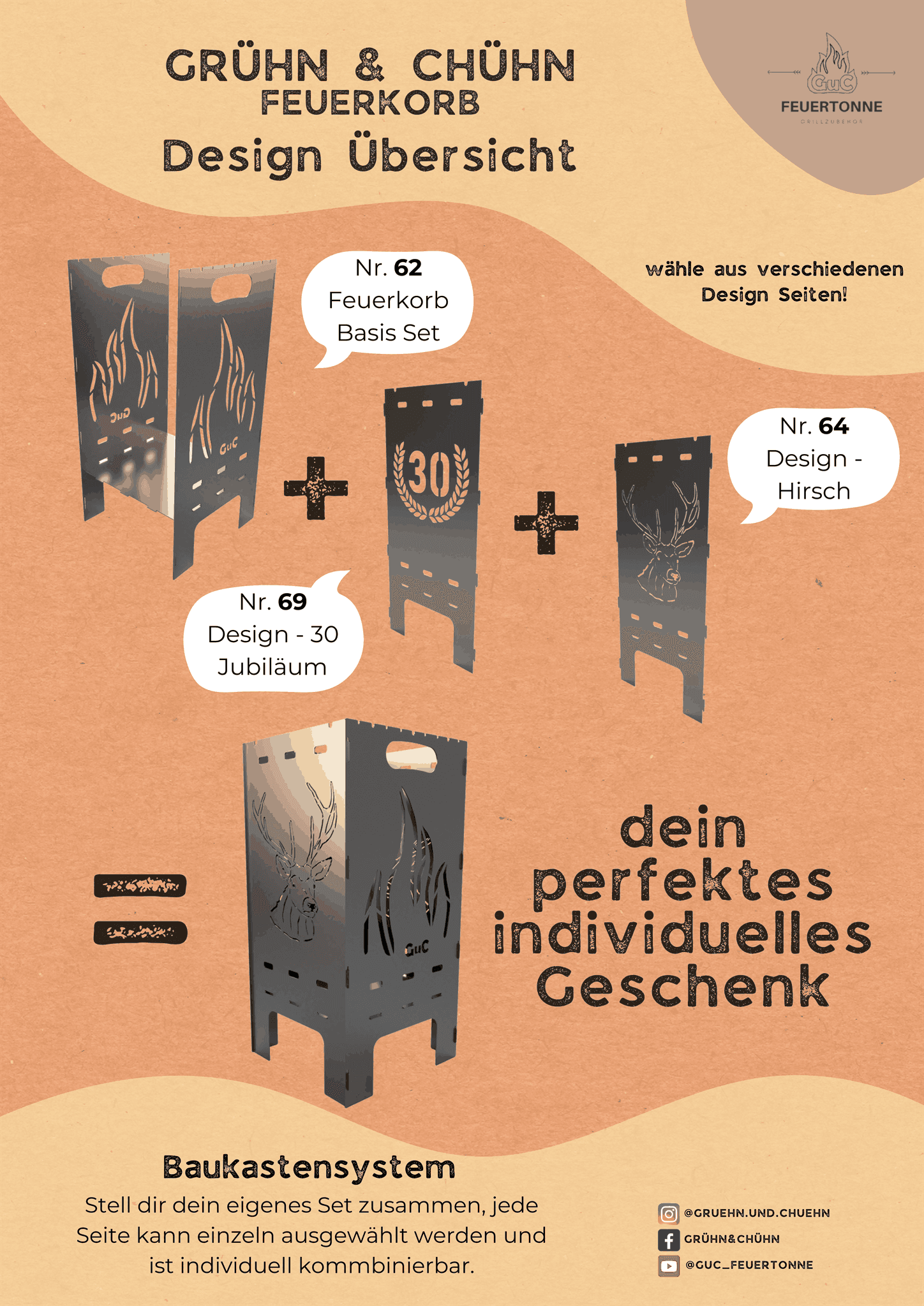 Mit dem GuC Feuerkorb Custom entscheidest du selbst, wie dein Feuerkorb aussieht. Dank Baukastensystem kannst du aus über 20 vordesignten Seitenteilen frei wählen und kombinieren – vom Jubiläumslogo über Naturmotive bis hin zu deinem ganz persönlichen Wunschdesign. So wird aus einem praktischen Feuerkorb ein echtes Statement und gleichzeitig ein unvergessliches Geschenk. Natürlich bleibt er genauso robust, flexibel und funktional wie alle unsere Modelle – nur eben in deinem ganz eigenen Style.